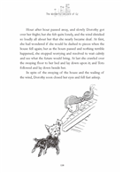 雖然陰暗無光,又有可怕的風聲在四周咆哮,桃樂絲發現她飛得很自在。屋子經過幾次旋轉,還有一次嚴重傾斜,她覺得自己好像搖籃裡的嬰兒,被人輕柔地搖著。