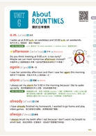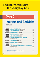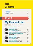 全書共兩大單元,每單元10課。Part1 My Personal Life(我個人的生活)、Part 2 Interests and Activities(興趣與活動),日常生活中從早到晚、從屋裡到屋外會用到的單字一應俱全!