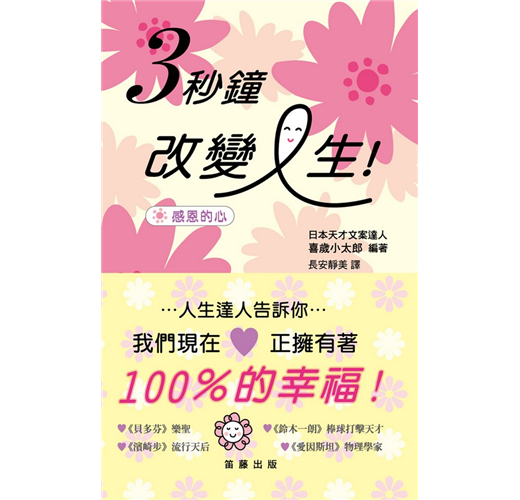 人生達人告訴你我們現在正擁有著100%的幸福!★《貝多芬》樂聖★《鈴木一朗》棒球打擊天才★《濱崎步》流行天后★《愛因斯坦》物理學家除了精選人生達人們的樂活名言,本書更收錄來自各階層讀者熱烈的迴響投書。字字珠璣,有如心靈溫泉的溫心小語,將帶領您展開一趟「發現恩典.心存感激」的感恩之旅!珍視自己&身邊的人.事.物吧!原來,他們都是上天賜予你最.美.的.禮.物!「人是為了帶給他人幸福,而來到這個世界上的。」—《愛因斯坦》物理學家不管處於什麼樣的狀態,都能在其中發現幸福、找到感恩。我們來到這世界,就是為了玩一場愉快的遊戲啊!—《萩本欽一》日本節目『超級變變變』主持人「拿出勇氣!儘管肉體有稍微缺陷,我的靈魂也必須戰勝這些缺陷不可!」by貝多芬貝多芬作品除去第一號之外,全部的作品,全部的作品,都是在他耳聾之後—完成的。—《羅曼.羅蘭》法國文學大師兩個人在一起不是「我想要這樣」或「我想要那樣」,而要隨著彼此相遇的緣分安身立命。或許唯有在那樣的時候,才會產生「美麗的情景」。來到我們身邊的,都是上帝的恩賜。—《鑽石》讀者.約聘職員