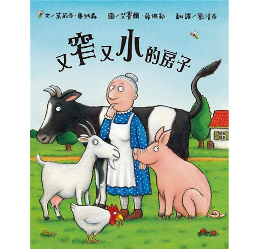 有位矮小的老太太,獨自住在一間房子裡。她向一位聰明的老先生抱怨、發牢騷:「我的房子真是又窄又小,實在太擠了,該怎麼辦才好?」聰明的老先生竟然回答她:「把你的母雞帶進屋子裡。」小房子裡多了隻亂飛亂撞的母雞,這下子小房子變得更擁擠了。然而,聰明的老先生卻要老太太接二連三的帶進她的山羊、小豬和乳牛,這些動物在小房子裡飛啊、叫啊、追啊、跳啊,讓老太太簡直快瘋掉可憐的老太太不僅連打噴嚏的地方都沒有,甚至煩惱得一直拉頭髮呢究竟聰明的老先生有什麼錦囊妙計?這些動物真的能幫助老太太又窄又小的房子變寬敞嗎?這則令人會心一笑的小故事,作者茱莉亞利用反覆的疑問句型,讓小朋友一邊享受閱讀的樂趣,一邊提升語文能力。而插畫家艾賽爾精彩頗富童趣的插圖,更增添了全書動物進屋後熱鬧又搗蛋的幽默效果。