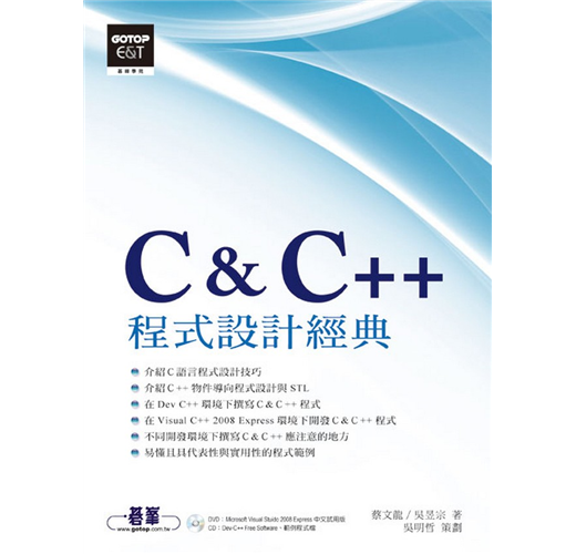 介紹C語言程式設計技巧介紹C++物件導向程式設計與STL在DevC++環境下撰寫C&C++程式在VisualC++2008Express環境下開發C&C++程式了解C語言與C++的差異不同開發環境下撰寫C&C++應注意的地方易懂且具代表性與實用性的程式範例本書共分C語言與C++兩個部份:第1-15章詳實介紹C語言程式設計技巧、第16-22章介紹C++物件導向程式設計與STL。書中範例淺顯易懂且具代表性與實用性,非常適合教學與自學,是一本C&C++程式設計的最佳入門書籍。書中介紹如何在DevC++、VisualC++2008Express的整合環境下開發C&C++程式,並詳實告知在不同的開發環境下撰寫C&C++應注意的地方,以最輕鬆的方式學習C&C++程式設計。精彩內容:1.C語言的架構2.DevC++與VisualC++2008整合環境介紹3.變數與資料型別4.C語言的格式化輸出入5.選擇結構6.重複結構7.陣列的活用8.使用者自定函式9.巨集與前置處理器10.C語言的變數等級11.指標的活用12.字元與字串13.結構、列舉、共用與自定新資料型別14.C語言的檔案處理15.C++與C語言差異介紹16.C++格式化輸出入與string字串17.多載函式、多載運算子、inline函式18.C++物件導向技術19.類別繼承與多型20.樣版21.STL標準樣版函式庫22.指位器、容器、演算法的使用