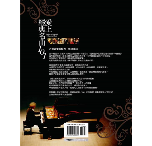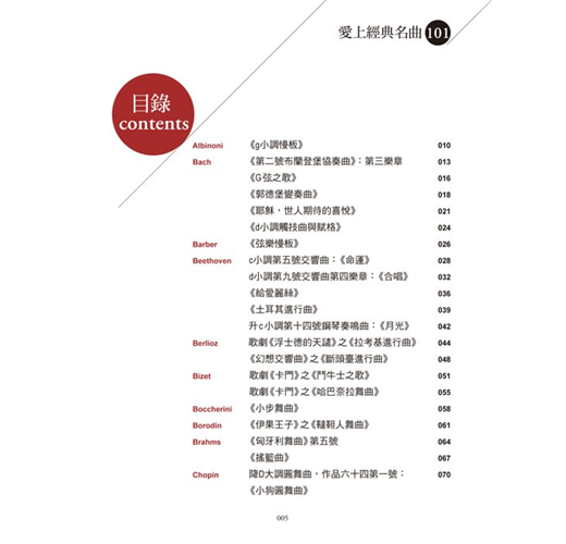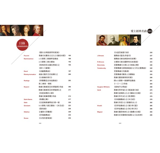 這101首在音樂史上赫赫有名、大家耳熟能詳、扣人心弦的名曲,從它的創作者、創作背景、成功的演出、有趣的創作故事、音樂家軼事,到相關的音樂知識;年代跨越了巴洛克樂派、古典樂派、浪漫樂派、國民樂派到現代樂派,概括了音樂史上重要音樂大師的精心傑作。