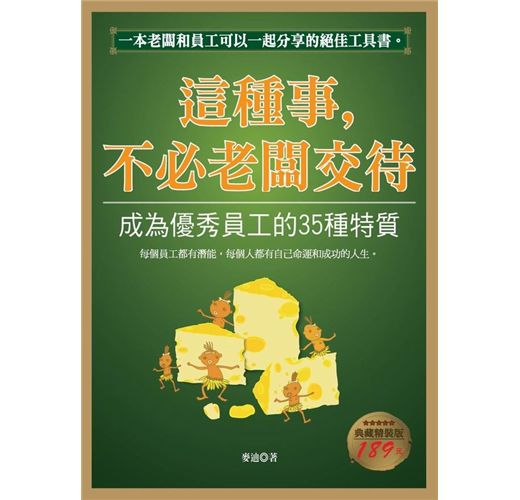 一個聰明的員工俱備了主動性,他就能採取直接的、重要的行動為公司獲得收益和取得市場成功。《這種事,不必老闆交待》一書揭示的就是職場上這一重要法則;身為員工,凡事要積極主動,該做的事馬上去做。依照這條法則,不管我們在哪家公司上班、擔任什麼職務,我們都能發揮影響力,並且替自己創造機會。 本書提出的建議簡單、具體。它告訴你該怎樣掌控工作和行動的主導權,該怎樣達成所追求的成效。引導你在工作中做出更多貢獻,也能幫助你從工作中獲益更多。這是一本老闆、員工可以共同分享的絕佳工具書。 職場上,員工聽命行事的時代已經遠去了。如果你想在職業生涯中,不斷追求成長與卓越,一定要好好閱讀這本書,凡事主動出擊,成為一個優秀的員工。 任何人都清楚,個人的成功是建立在團隊成功之上的,沒有企業的快速增長和高額利潤,我們也不可能獲取豐厚的薪酬。 企業的成功意味著老闆的成功,也意味著員工的成功,也就是說,你必須認識到,只有老闆成功了,你才能夠成功。老闆和員工的關係就是「一榮俱榮,一損俱損」,認識到這一點,你很快就能在工作中贏得老闆的青睞。 一般說來,時時刻刻和老闆保持一致並幫助老闆取得成功的人,往往最終會成為企業的中堅一員,自己也會成為令人艷羨的成功人士。 不僅如此在很多時候,老闆們欣賞能做好自己工作的人。能夠做好自己的工作,是成功的第一要素。 本書共分成六大章節一起來探討老闆與員工的態度,其內容大綱羅列如下;第一章 企業的終極期望 每天世界都在變,「誰是最可愛的員工」這個被無數老闆重覆著無數遍的話題,其「內涵」也隨著時代在演變,不斷的被延伸、昇華,並且發生著實質上的變化。第二章 該做的事馬上去做 很多時候,你若立即進入工作的主題,會驚訝地發現,如果拿浪費在「萬事俱備」上的時間和潛力處理手中的工作,往往綽綽有餘。而且,許多事情你若立即動手去做,就會感到快樂、有趣,加大成功機率。第三章 成為公司─必不可少的人 想要成為公司必不可少的人所具備的條件不外乎要有良好的精神狀態,是你責任心和上進心的外在表現,喜愛公司賦予自己的工作,全心全意、不留餘力地為公司增加效益,更要不斷的學習,懷有一顆感恩的心,這也正是老闆所期望看到的。第四章 職場必備的美德 所謂美德應該俱備『忠誠』、『誠實』、『勤奮』、『敬業』、『熱情』。第五章 發現真正問題的所在 職場中,一些自認為聰明、能力較強及受過良好教育的人會對一些工作中常見的問題視而不見。這些問題看小實大,警覺的人會想辦法避免它們發生,可是誤其中的依然很多,你可能也在其中,不及時自省,它們對你的危害就可能會越來越大。第六章 獲取終極獎勵 何不從現在開始,做一個行動者吧!做一個值得信賴的員工,不再用老闆一連串的提醒或不斷地要求,自動自發地把事情做好,獲取企業的終極獎勵。 本書取材豐富多樣、意涵深刻,特別提出35個重點叮嚀讀者,讓您更清楚的明瞭優秀員工所必備的特質。