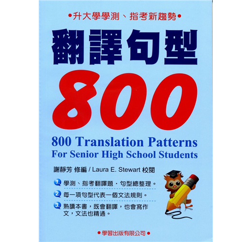 今年大學學科能力測驗新增了「翻譯題」,同學唯有熟悉題型及多加練習才能在英文科上拿高分。 「翻譯句型800」將複雜的英文文法,濃縮成800個句子,並按照文法規則分類,同學利用練習翻譯的機會,同時也熟練了文法,而且背了這些句子對英文作文也有很大的幫助。
