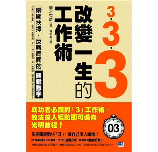 日常生活中,你如何看待「3」、運用「3」?因為這小小的「3」,將可能改變你的一生!日本知名廣播節目製作人──清水克彥,有鑒於忙碌工作需要更妥善的時間管理,創立一套能充分利用時間的工作術,並彙整成40種可立即實踐、生效的活用方式,鼓勵抱有幹勁但缺乏行動力的人,善用瞬間抉擇來反轉局面!
