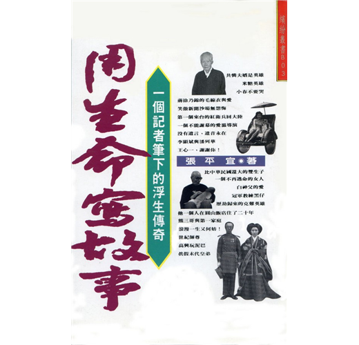 ●新聞幕後 蔣徐乃錦的毛線衣與愛 共憐夫婿是英雄-孫立人與兩位夫人 米糖英雄 笑傲新聞沙場無怨悔 小春不要哭 第一個來台的紅衛兵回大陸 沒有遺言,遺音永在-記微笑的紫色薔薇 一個不能謝幕的愛滋導演 李顯斌與潘列華 王心一,謝謝你!●浮生十記 白神父的愛 比中華民國還大的雙生子 一個不再逃命的女人 冠軍教練黑仔 他一個人在圓山飯店住了二十年 熊三哥與第一家庭 高興玩泥巴 世紀師尊 歷劫歸來的克難英雄 浪漫一生又何妨!●真假末代皇弟 (一)台灣的末代皇弟-溥佗傳奇 (二)誰是真的?-兩岸四個溥任真假...