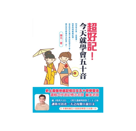 記億法學習大師陳光老師繼《吸英大法》、《英文這樣背就對了》之後,針對一般人學習日文時最常遇到的問題,就是五十音背不起來,要不就是背了之後很快就會忘記等學習障礙,促使陳光老師要告訴大家如何同樣可以利用記億法來學習五十音,而且一但學會就永遠不會忘記五十音。