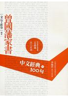 《中文經典100句:曾國藩家書》內容所介紹的名句有:「吾不望代代得富貴,但願代代有秀才」、「養生以少惱怒為本,立身以不妄語為本,居家以不晏起為本,居官以不要錢為本,行軍以不擾民為本」、「根好株好而後枝葉有所託;柱好梁好而後椽瓦有所麗」、「讀書之法,看、讀、寫、作,四者每日不可缺一」等等。透過淺白的文字,深入了解近代風雲人物曾國藩治家、交友、為政、處世、理財之道。