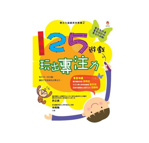 《125遊戲,玩出專注力》是透過5個遊戲主題,包括迷宮、連連看、數字著色、密碼破解、找出躲藏的字,總共125個遊戲,來增進小朋友的專注力。