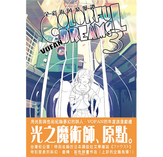 相片總是寫真,影像總是寫實——真與實的交界,總是寫意。以生活情境為主軸,描繪日常中的非日常——從台北101的幻視風景,到徘徊暗夜的學校怪談——那些只在腦海中浮遊的不可思議,化為只屬於你的詩情夢幻全彩呈現。《全彩街角浪漫譚 COLORFUL DREAMS 3》裡除了結集VOFAN從2006年10月至2008年1月間於《挑戰者月刊》所連載,揉合漫畫與插畫手法加上新詩風格對白繪製的12篇彩色詩畫(Color Illustory),更特別收錄發表於日本講談社《Comic FAUST》、《FAUST》雜誌的兩篇台灣初公開作品。卷末並附錄與作者VOFAN與《挑戰者月刊》總編輯林依俐、《FAUST》總編輯太田克史的超長三人座談紀錄,公開關於《挑戰者月刊》、《FAUST》揭載之系列作,以及西尾維新小說《化物語》插畫工作的珍貴幕後花絮。