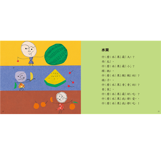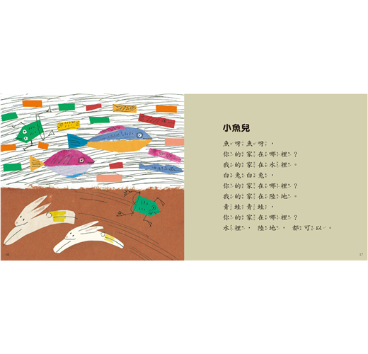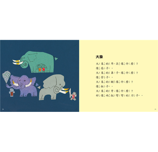 本書採用「問答」兒歌形式,林良爺爺的童詩圍繞著幼兒的生活經驗,內容包含日常寒暄像是「你幾歲?」、「爸爸在哪裡?」、「你家有幾個人?」和孩子感興趣的自然事物與現象像是「大象」、「打雷」,孩子能在一問一答、你說我猜的念唱間,滿足預測答案的樂趣,增進語言表達和思考的能力。除了歌詞能精進幼兒的語言感知之外,趙國宗老師以拼貼風格設計出充滿童趣的插畫,開啟孩子的無限想像,多元的圖素也豐富了親子間的共讀話題。