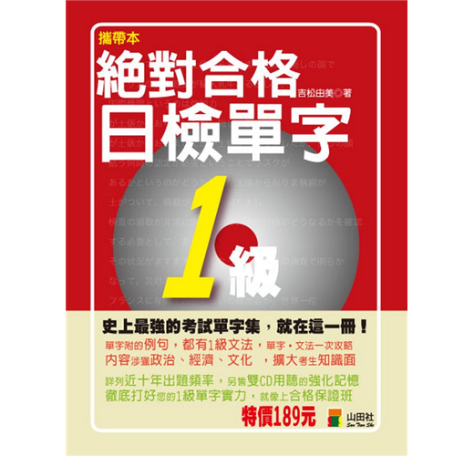由於瑣碎的時間,小兵立大功,讓不少考生考上日檢了。為了響應讀者的需求,山田社精心地把《絕對合格!日檢單字1級》做成方便隨身攜帶的「攜帶本」了。全國首創單字跟文法一起學習,精心編寫一個句子裡有1級單字,還有1級文法,再加上每個句子的內容包羅萬象,這樣可以一次把1級的單字、文法,甚至閱讀都完全掌握了!