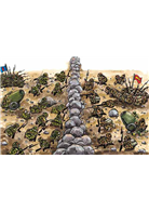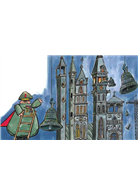 在這本以反戰為主題的繪本中,從頭到尾幾乎沒有對白,也沒有提及戰爭發生的原因,只有「呯砰炸彈超級大將軍」和「呯碰神槍致命大元帥」不停的想用大砲打敗敵人。但從作者對戰爭情況的描述,我們卻也可以清楚認識到戰爭對任何人都沒有好處:「兩個打仗的國家都死了很多士兵」、「士兵們在戰場上,……不停地用槍射擊敵人」、「大砲跟槍用了很多很多」……。最後,在彈盡援絕之際,兩個大將軍跟大元帥只好使出殺手鐧,從教堂裡搜刮大大小小的和平鐘來造大砲,準備把敵人轟上月球!