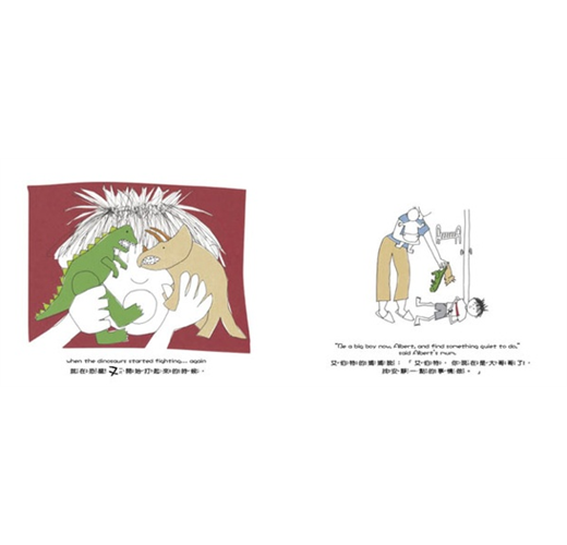 艾伯特發現他可以跳過惡龍潭,而且比十六隻螞蟻加起來還要大。有時候他好大、好大,大到可以跳過房子,可以幫忙飛不動的飛機在天空飛行。但是,艾伯特也發現他比一朵花還要小,而且比天空小好多、好多。