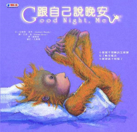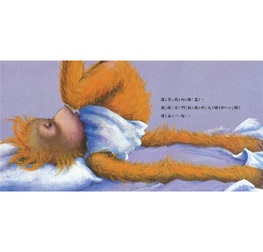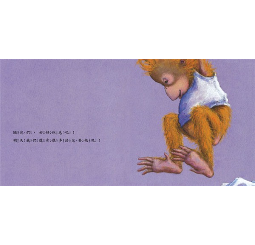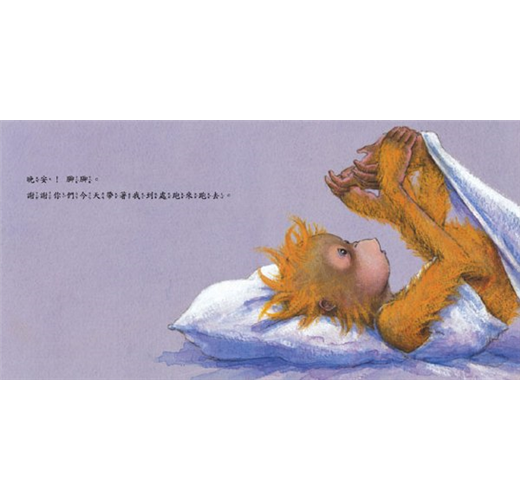 「晚安!腳腳。謝謝你們今天帶著我到處跑來跑去。還有我的膝蓋,謝謝你們把我的大腿和小腿連在一起。腿兒們,好好休息吧!明天我們還有很多活兒要做呢!肚子呀!我可不希望聽到你整夜咕嚕咕嚕地叫!你可以待在那兒好好休息──但是,不要休息過了頭囉!……祝福你,鼻子!你聞到「睡覺」的味道了嗎?噓~嘴巴。不要再問東問西。就道聲晚安吧!……」做了這麼一趟晚安之旅,小猩猩從頭到腳一一跟自己道過晚安,然後暖暖的、甜甜的、安穩的入睡了!