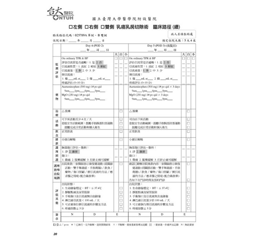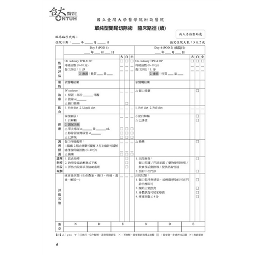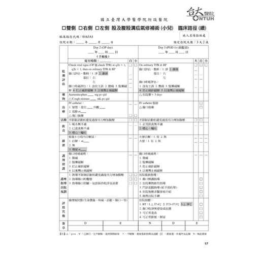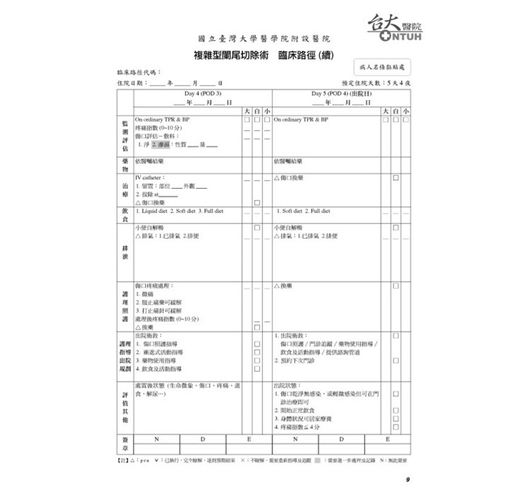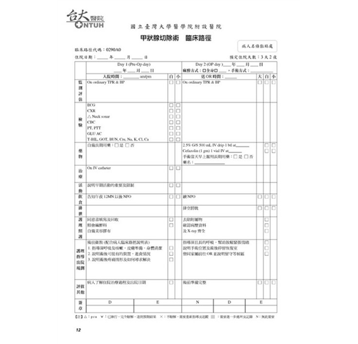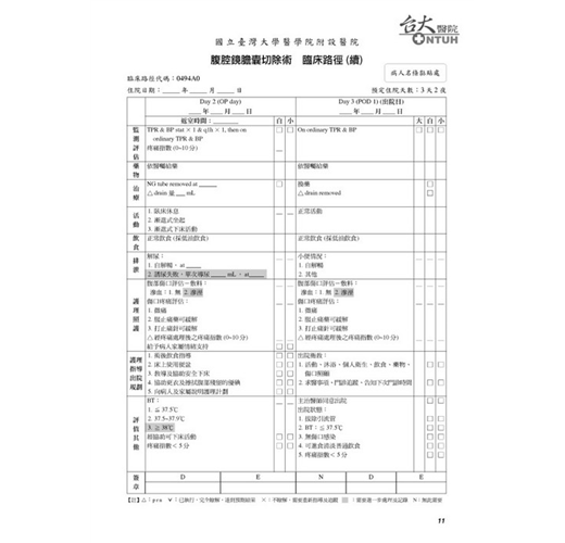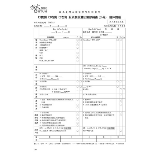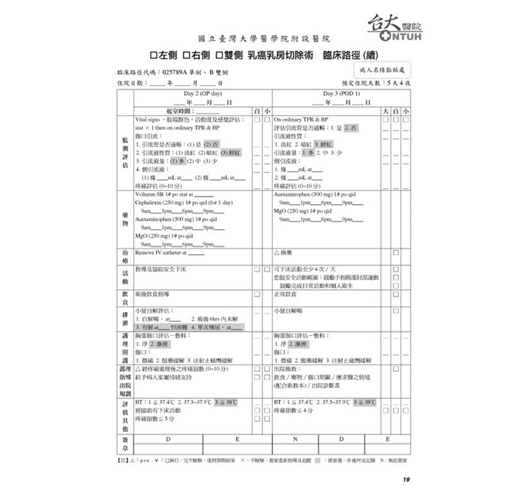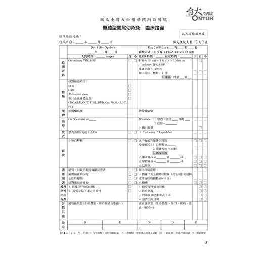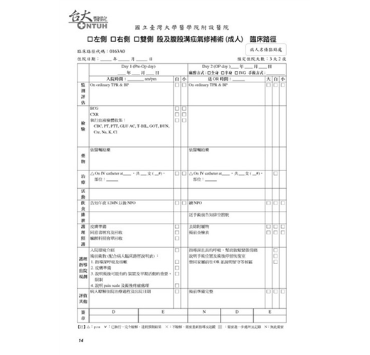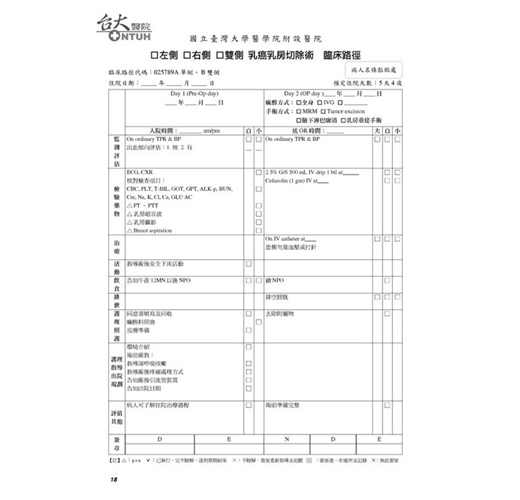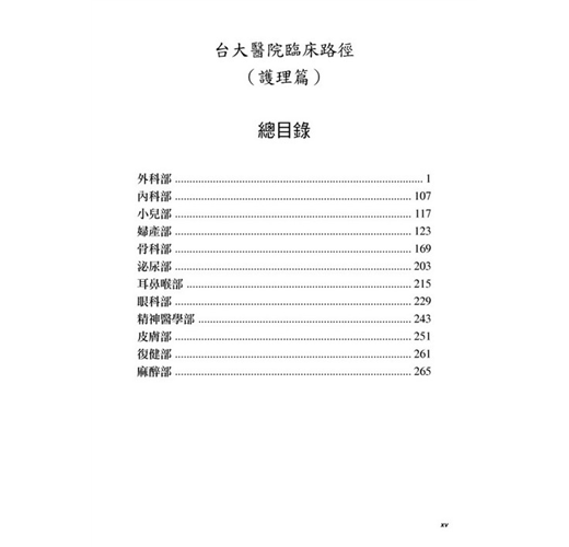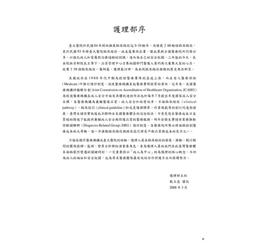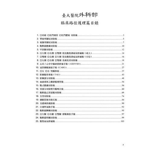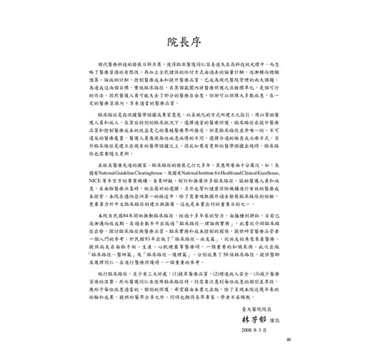實施臨床路徑至少有三大好處:(1)提昇醫療品質,(2)增進病人安全,(3)減少醫療資源的浪費。然而醫護同仁在用臨床路徑時,仍需要注意到每位病患的個別差異性,應給予每位病患適當的、個別的照護。「臨床路徑--醫師篇」及「臨床路徑--護理篇」,分別收集了台大醫院的58條臨床路徑,提供醫師及護理同仁在進行醫療照護時的參考。