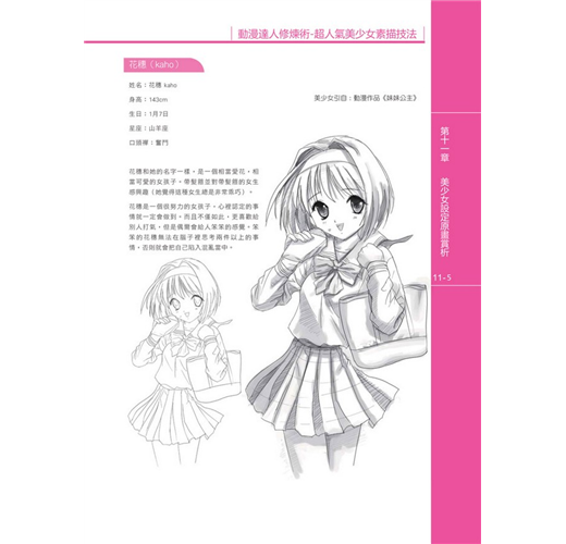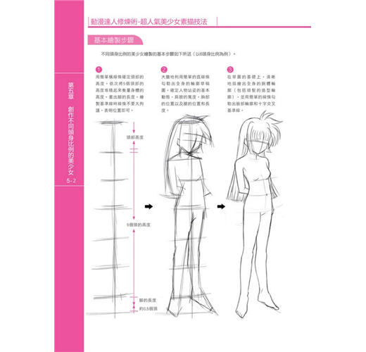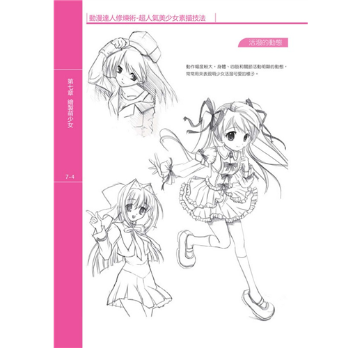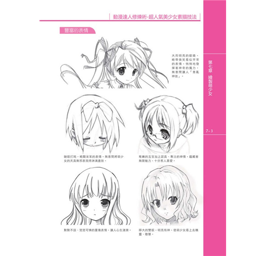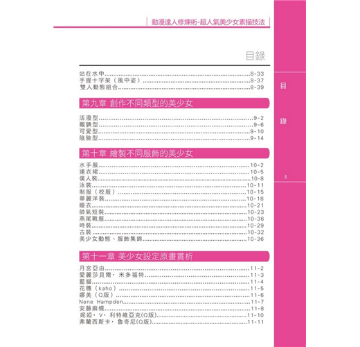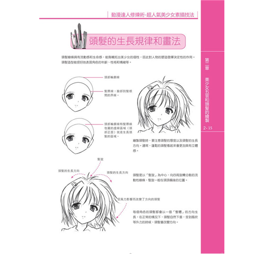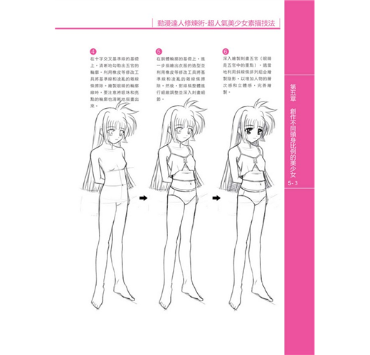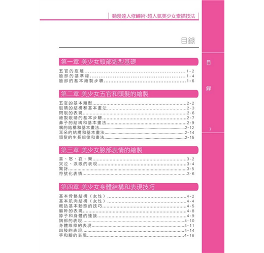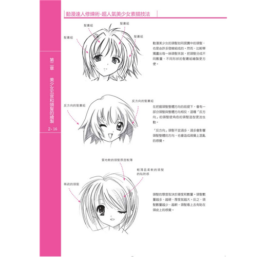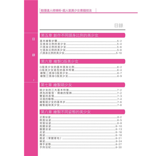 內容涵蓋廣泛,包含美少女五官、頭髮、臉部表情、身體結構..等等技法,一應俱全。