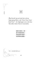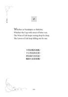 珈音有「波斯李白」之稱,似乎更近太白。在狂歌縱酒的表象之下,他們同樣洞徹人生虛幻無常的真相,而潛埋心底的「天問」,卻是連天地神祇都只有無言以對的大惑,但他們以絕美的純詩,將纏繞終身的「死結」,表達得如此淋漓盡致。