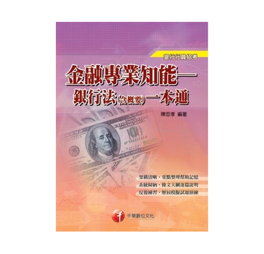 本書係針對參加金融業(包括銀行各類考試、中華郵政、農會等)及公務人員(含財政部所屬金融保險事業機構)升等考、新進人員招考等考試,「銀行法(含概要)」、「銀行法大意」、「綜合科目(銀行法部分)」等科目複習準備應試之需要而編。,依照法條重點做系統歸納,意在幫助同學於最短時間內有效複習,把握考試重點與方向。