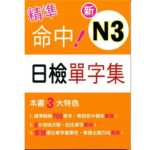 《精準命中!N3日檢單字集》並參考出題基準,精準預測出題方向。此外,有別於世面上一般的日檢單字書,本書是以領域來分類單字,分為「生活」、「學校」、「性格」、「文化」、「自然科學」、「商業經濟」、「副詞」、「片假名」、「其他」,9類單字,相信此種分類能讓讀者體察單字的關連性,絕對有助於記憶。此外,本書將我們預測極有可能出現的單字用星號標出來,讓讀者在背誦時能多加留意。