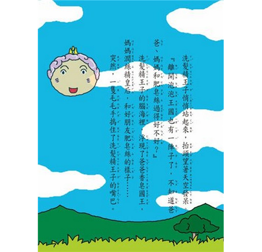 洗髮精王子的腦海裡,突然浮現了自己的爸爸—香皂國王、媽媽—潤絲精皇后,和好朋友肥皂絲的樣子,就在這個時候……