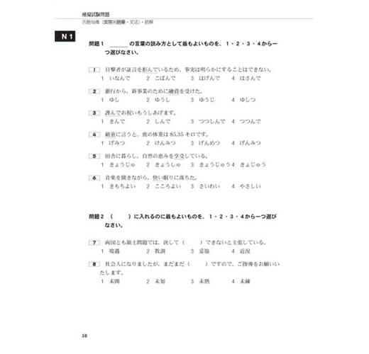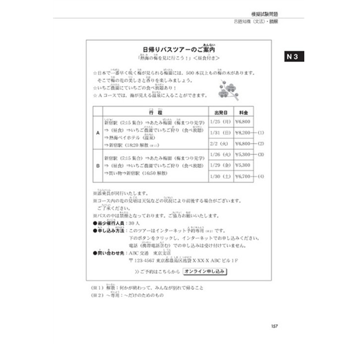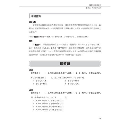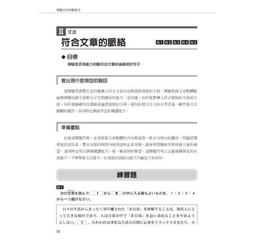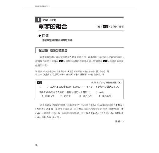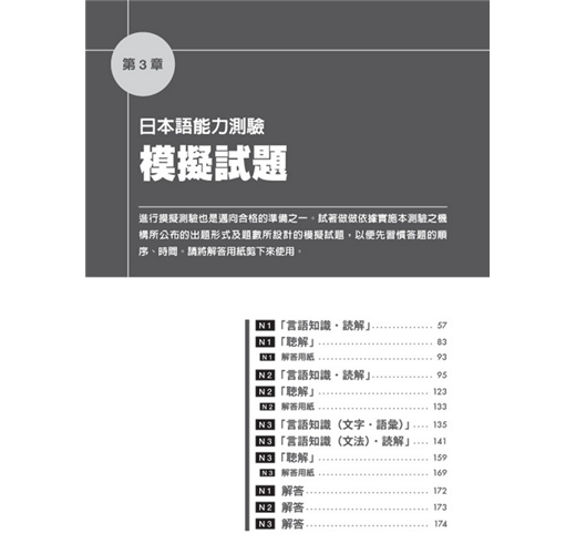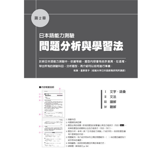 本書第二章《問題分析與學習法》,將「日本JLPT官方手冊」所公布的題型範例全數拆解,逐一分析,並提示應考準備重點,最後在每個題型後,附上練習題。考生可藉此熟悉各種題型,學習獨家的解題技巧,讓考生事半功倍!