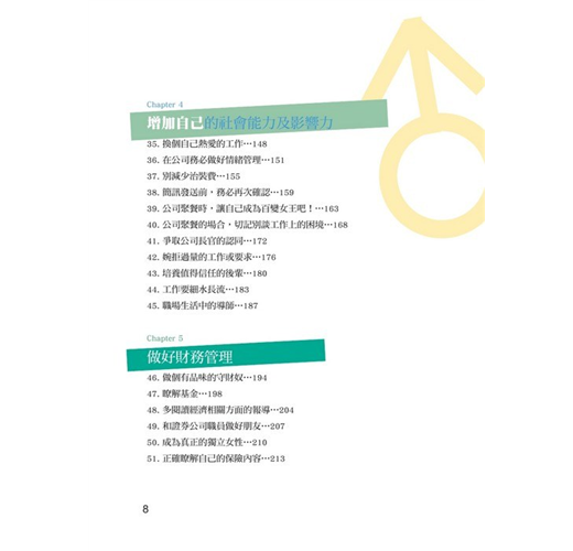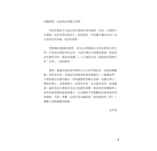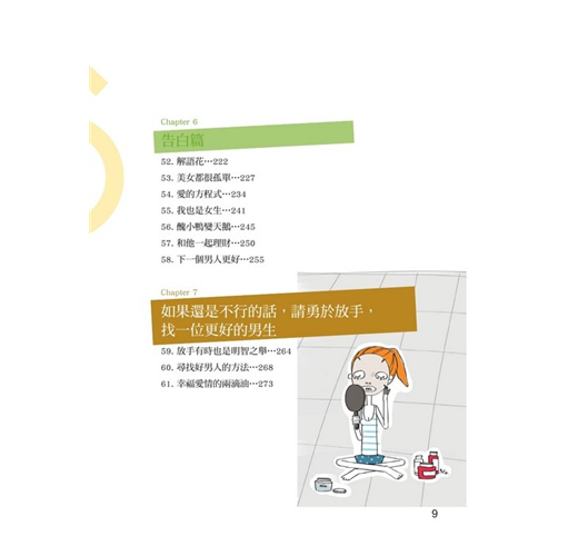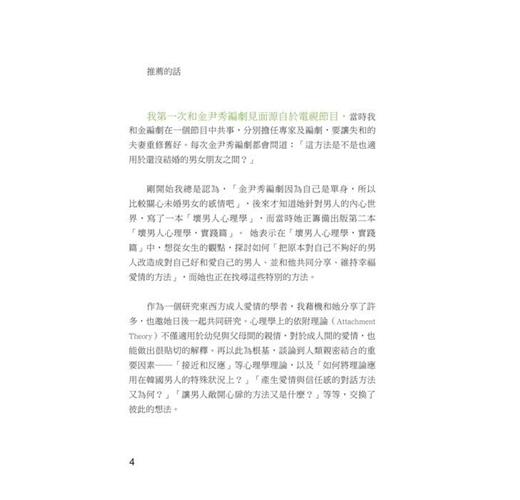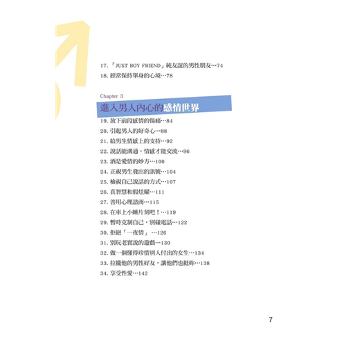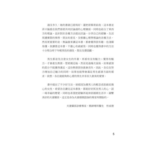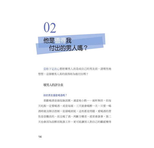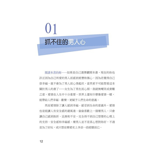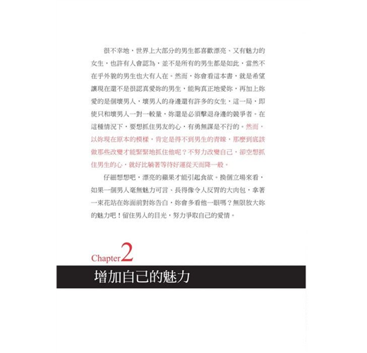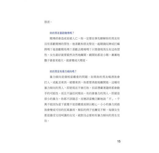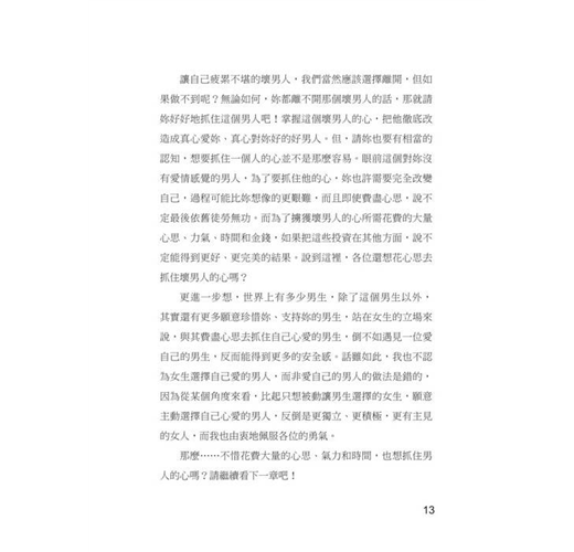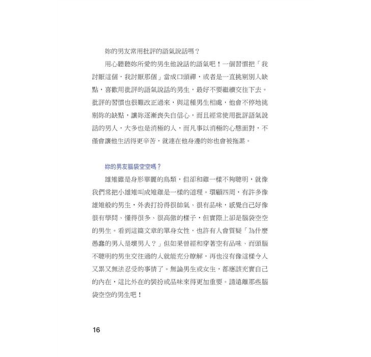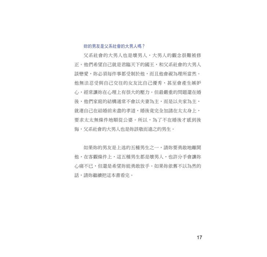 □妳的男友是父系社會的大男人嗎?如果妳的男友是上述的五種男生之一,請妳要勇敢地離開他,在客觀條件上,這五種男生都是壞男人,也許分手會讓妳心痛不已,但還是希望妳能勇敢放手。如果妳依舊不以為然的話,請妳把這本書看完。