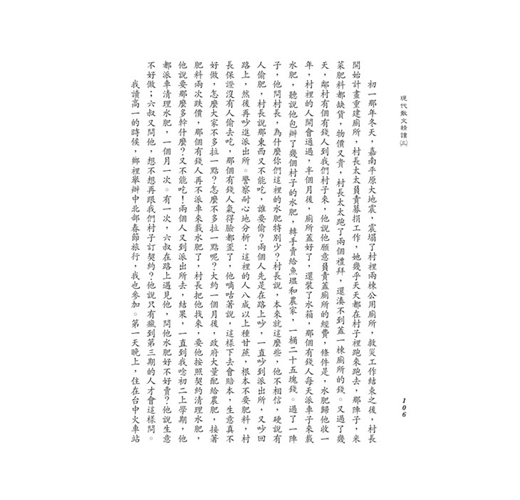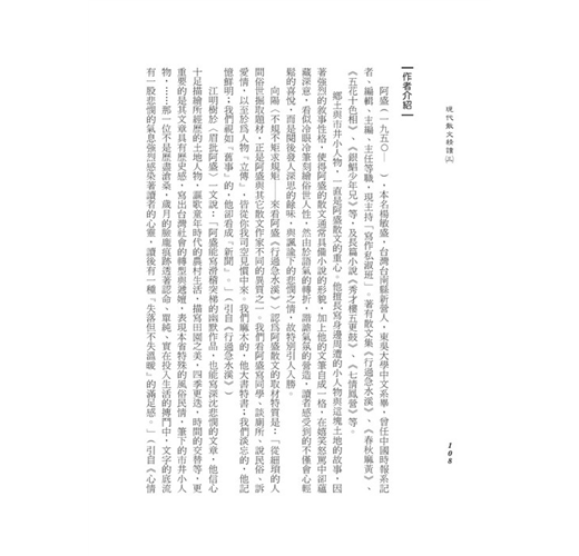 全書共有21篇文章,選錄近代多位文學大家之優美作品。選文文體包括議論、記敘、抒情、描寫等,以滿足各類範文之要求。適合各大專院校學生作為教科書或日常閱讀之讀物,對於學生文學素質的培養具有相當豐富的價值。