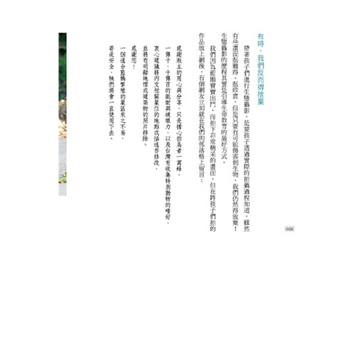 從書稿裡也可以看出來,基煌老師不斷的思考自己的教育觀、探索「微型課程」的實驗,透過教學歷程紀錄,不斷省思和追求。帶著孩子上山下海,透過生態攝影,把孩子帶進自然、帶進生態世界、帶進藝術世界、帶進生命體驗的領域。