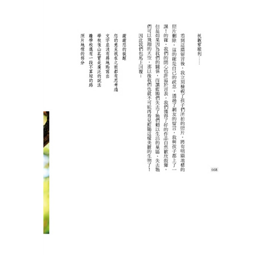 但另一方面,有在經營部落格的人應該也有類似的經驗,就是寫完了以後,自己便很少會再去看之前寫過的文章,除非是有新的回應。為了這本書,編輯曾事先整理了部落格的許多文章。以編輯的角度整理和詮釋後,我才知道,原來我的文章給人那樣的感覺。這也讓我重新審視過去的自己。