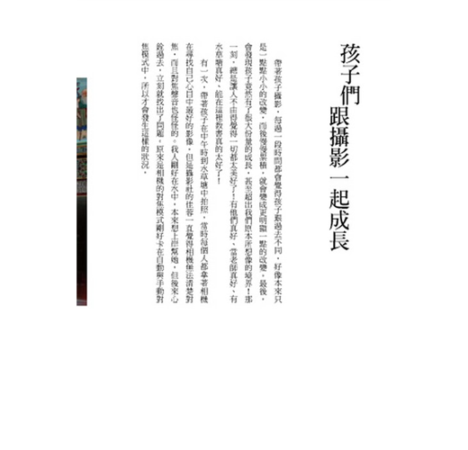 發發牢騷寫寫心事倒還可以,但是要變成文章出版,我可真是要謝謝出版社的抬舉……。雖然孩子所拍的影像才是這本書的重點,但是白紙黑字的,要是寫不好,書賣出去後可是收不回來的,所以壓力真的滿大的,這份壓力可不比寫論文時來得小。但不同的是,這本書的內容都是我喜歡且走過的路,所以我還滿樂在其中的。