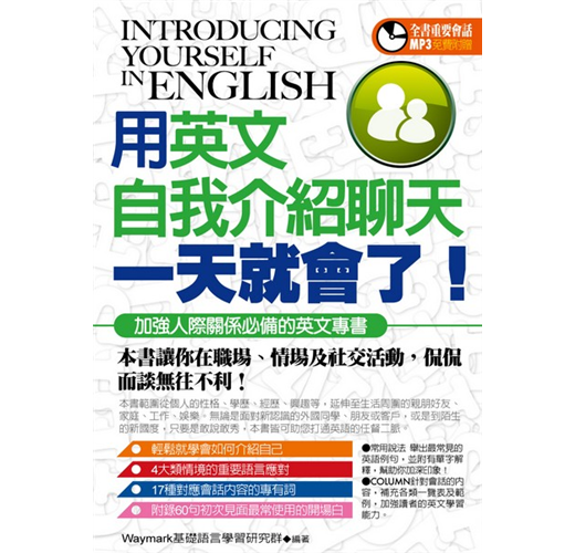 本書範圍從個人的性格、學歷、經歷、興趣等,延伸至生活周圍的親朋好友、家庭、工作、娛樂。無論是面對新認識的外國同學、朋友或客戶,或是到陌生的新國度,只要是敢說敢秀,本書皆可助您打通英語的任督二脈。