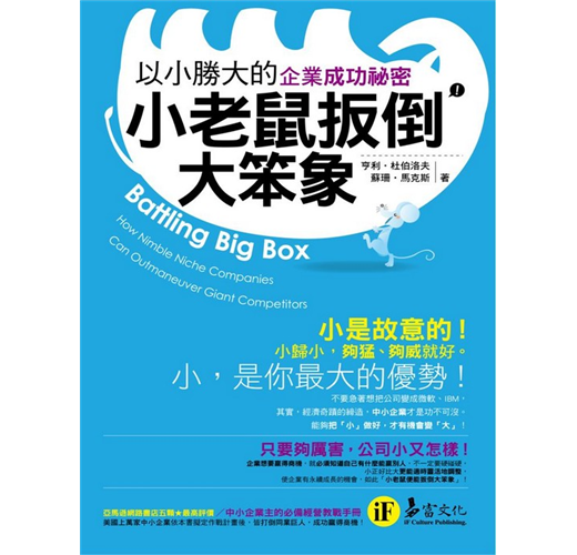 在每天都有這麼多起中小企業不幸失敗的案例下,你或許會認為,要他們在這些遊戲中擊敗像威名百貨(Wal-Mart)、百思買(Best Buy)和家得寶(Home Depot)這樣的大巨人,簡直是件不可能的任務。可是,你錯了!著名的專欄作家馬克斯和杜伯洛夫,已在《小老鼠扳倒大笨象》中確切的說明,中小企業是如何無視於那些企業巨擘的無情攻擊,充分適應並緊緊抓住他們的顧客和市場。作者訪談了許多成功的中小企業主,因此讓人回味無窮的訪談內容在書中可謂俯拾皆是,而且許多寶貴的資料來源更可隨處拈來,讓你在這場與企業巨人的戰爭中擁有足夠的武器裝備。