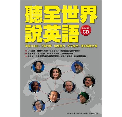 「世界的英語」從世界經濟論壇(達弗斯會議)中,嚴選出全球20個國家、26位財經首長及名人的發言,隨書CD原音重現、現場直送,可邊聽邊對照。書中還有同步翻譯、解說,以及該篇言論的背景介紹,藉此了解國際局勢、政經、種族、領土、能源及目前最為世人關切的環保議題。每位國際領袖在會議上的金句名言摘錄,更能成為你背誦運用的好範例。透過各國代表的發言,不僅能習慣每個國家不同的英語腔調,並且向這些國際菁英學習怎樣使用英語、放眼全球觀察國際局勢,以及如何在重要場合上表達自己,不論是面對NEW TOEIC 多國口音的聽力測驗、出差洽公與外國人士開會交談、參加任何國際會議及社交場合等,都能從容應對進退,讓你更有國際觀及競爭力。
