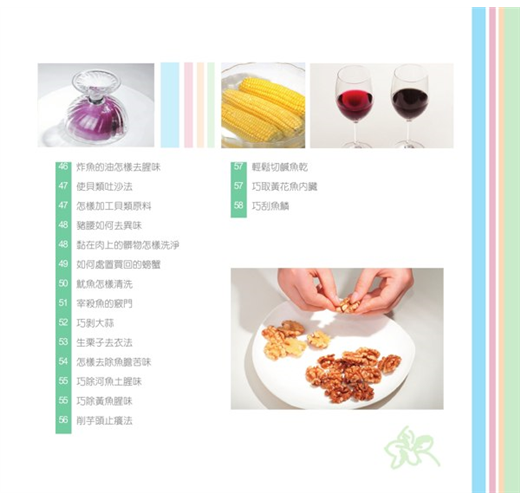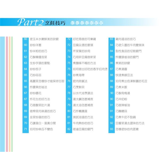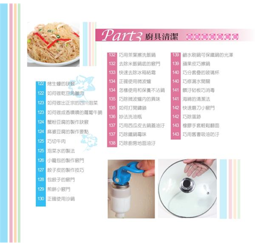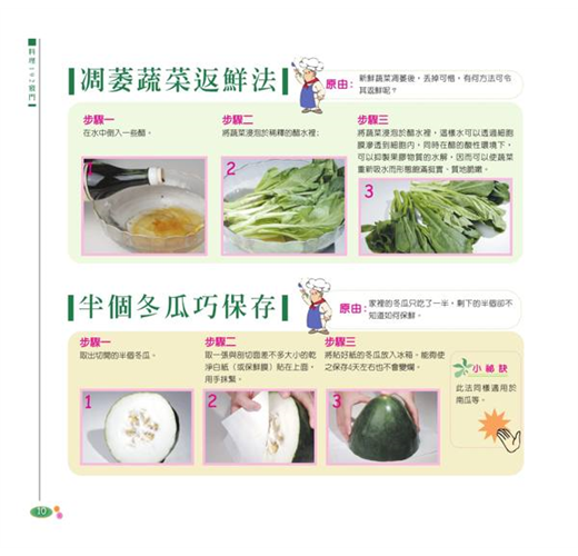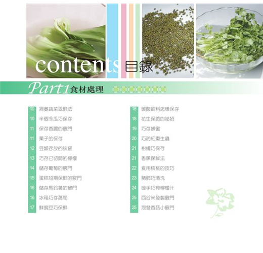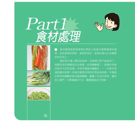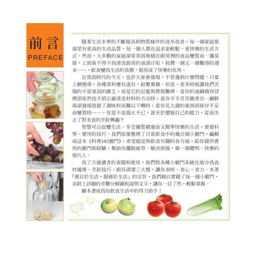 創意收納法,空間利用最大化★食物處理食物保鮮、食物儲存、食材清洗,讓你輕鬆應對,化繁複為簡單,減少準備材料的時間。 ★烹飪技巧食物加工、食材烹煮、去除海鮮腥味,讓你輕鬆做出好菜,享受烹飪的樂趣。★廚具清潔去汙漬、去油漬、保養廚具的方法,善用這些小祕訣,清潔除垢不費心力,擁有舒適生活。