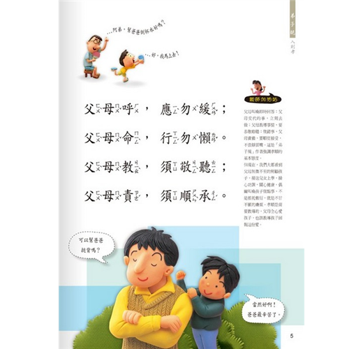 爲了活學活用「弟子規」,我們將原文內容編輯為上、下兩冊,內有:(一)故事趣味漫畫:以一位名叫阿福的淘氣小朋友為主角,將「弟子規」的原文生活化,與孩子的生活結合,活學活用內文中所有闡述的道理。(二)標示注音符號的原文:字大清晰,方便孩子閱讀。(三)白話解說:將原文做深入淺出的說明。