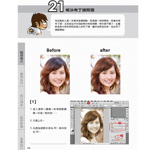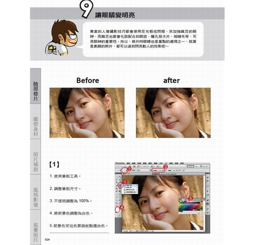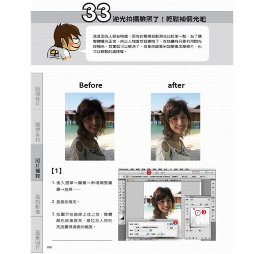 自從數位像機普及之後人手一台像機,每天每天都有好多照片產出,但千辛萬苦拍出來的照片卻常常無法盡如人意,可能光線太暗或是路人擋路甚至是昨晚吃太多小腹突出,還好有了Photoshop軟體,現在就一起來學習修圖大師奧米加的方法,輕鬆把腿拉長,把腰變瘦,讓臉變美,掩蓋小瑕疵,解救獨一無二的美麗照片,模擬高貴的單眼像機,把70分的照片輕鬆變成100分!