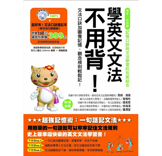 各位同學!DORINA 老師回來啦!在成功地利用律動口訣教大家輕鬆記住英文發音(《學自然發音不用背》、《學英文音標不用背》)和單字(《學英文單字不用背》)後,DORINA 老師這次要教大家輕鬆記住英文文法!