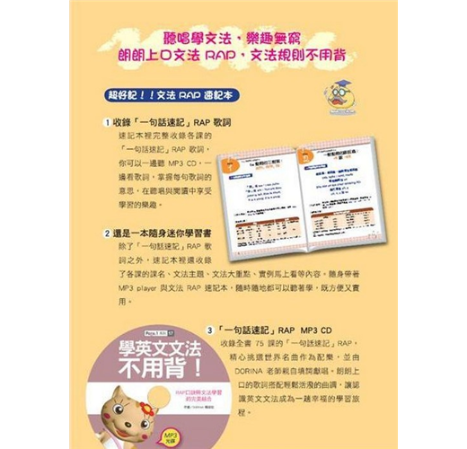 只要簡單的一句話,就能快速記住文法規則;搭配記憶口訣歌詞,輕鬆說唱就能把文法記起不會忘!從今天起,再也不必為記憶文法而苦惱,而是從快樂活潑的樂曲氛圍裡,享受學習文法的樂趣。