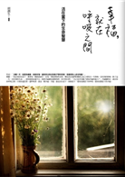 這是一本關於自我覺醒的心靈勵志床頭書。期待在一則則充滿哲思的小故事中,透過對生命的省思、對心靈的啟迪、對幸福的詮釋,能讓讀者在心靈淨化的過程中,體會生命的珍貴,學會愛惜生命、感謝生命,在一呼一吸中體驗生命之美好、幸福之所在。