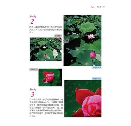 全書取景內容將教您如何拍攝盛開的蓮花、飄逸的芒草、體驗河流的生命…,另有以傳統、夜景、自然、人像、建築物、特寫等主題作為區分介紹。將作者十多年的攝影經驗,以簡單易懂的方式完整呈現在這18個攝影主題之中。