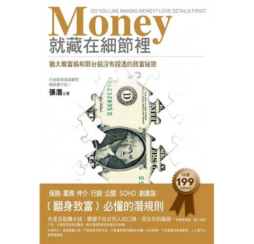 「天下大事,必做於細。」窮人是細節的奴隸,而富人則是細節的主人。M型時代,用錢滾錢已是傳統舊思維的賺錢方式,只靠行銷戰略、話術,或懂得識人術、讀心術,也不保證致富,你要像猶太富翁一樣跑在細節前面,透過架設好的財富水管與水庫,讓系統自動產生業績。參閱本書【翻身致富】的錢規則,學會建構致富引擎,你就能成為M型右邊的億萬富翁。