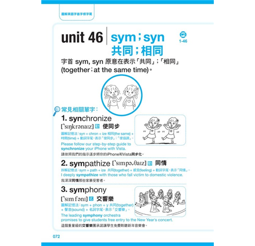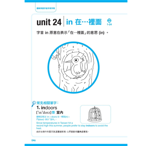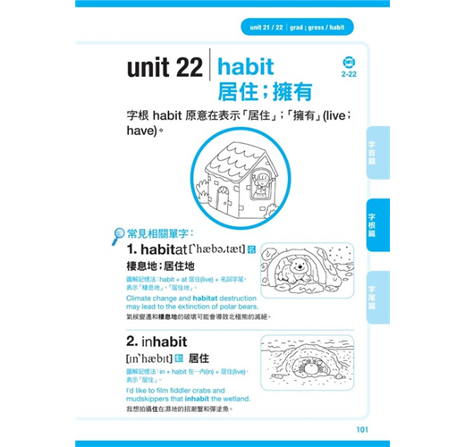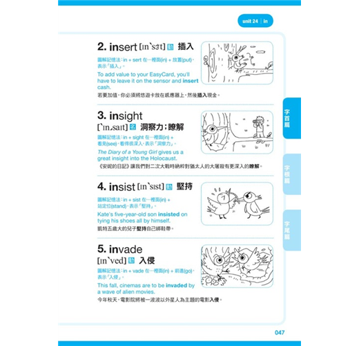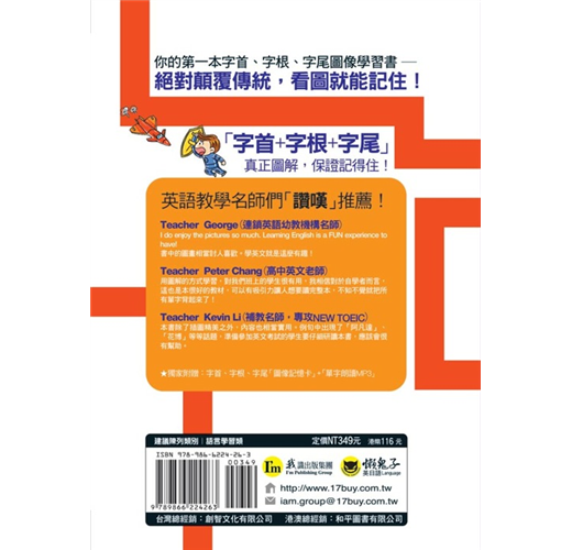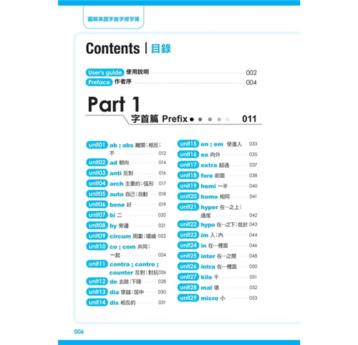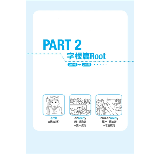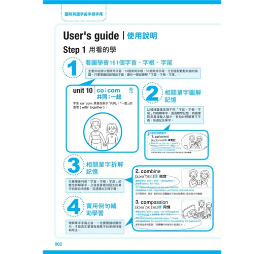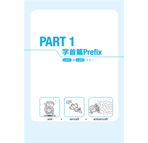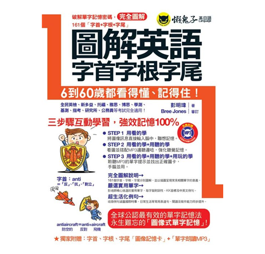 全書共收錄52個常用字首、59個常用字根、50個常用字尾,分別搭配輕鬆有趣的插圖,只要看圖就能猜出字義,讓你一眼就瞭解「字首、字根、字尾」。
