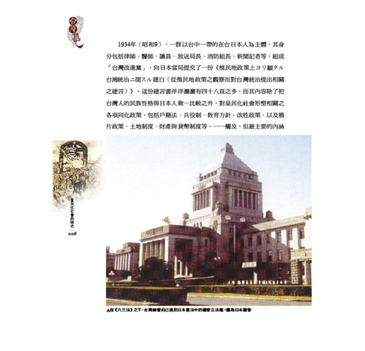 1934年(昭和9),一群以台中一帶的在台日本人為主體,其身分包括律師、醫師、議員、放送局長、消防組長、新聞記者等,組成「台灣改進黨」,向日本當局提交了一份《植民地政策上ヨリタル台統治ニスル建白(從殖民地政策之觀察而對台灣統治提出相關之建言)》。這份建言書洋洋灑灑有四十八頁之多,而其內容除了把台灣人的民族性格與日本人做一比較之外,對皇民化社會形塑相關之各項同化政策,包括戶籍法、兵役制、教育方針、改姓政策、以及鴉片政策、土地制度、財產與貨幣制度等,一一觸及,但最...