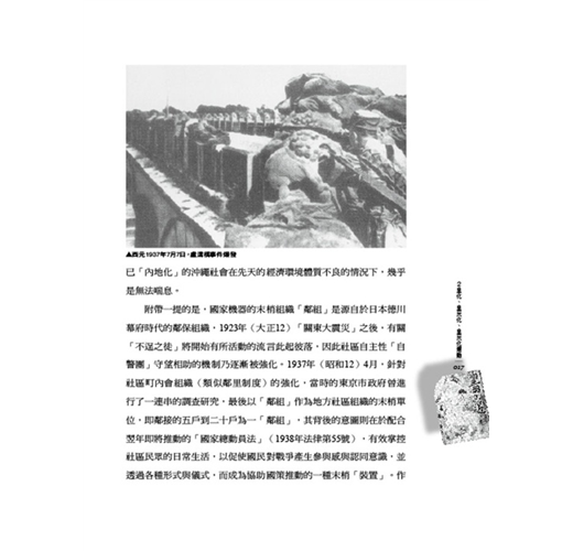 1937年(昭和12)中日之間爆發盧溝橋事變,進而引發了兩國之間的八年戰爭。為了因應戰時體制的需要,日本乃通過《國家總動員法》,以有效控管人流與物流的統制與應用。而當日本本土陷入上述的困境時,台灣總督府如何因應當前局勢的演變?而台灣民眾的生活又過得如何呢?在進入正題之前,我們先看看同樣是位處帝國領域邊陲地帶卻具有異質文明色彩的沖繩縣,情況又是如何呢?除了配合戰時體制下的國策,所有的政令必須由中央經府縣、市町村、町內會、部落會、到國家神經的末梢細胞「鄰組」,確實執行之外,早已「內地化」的沖繩社會在先天的經濟環境體質不良的情況下,幾乎是無法喘息。