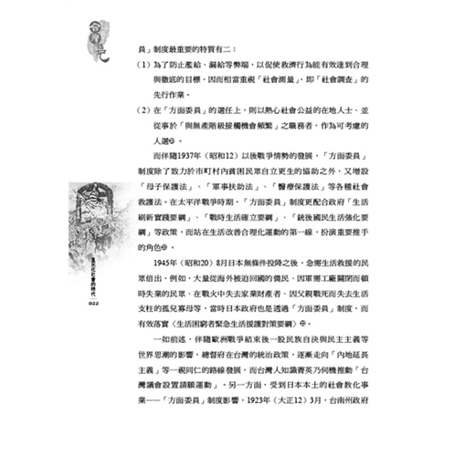 所謂「皇民化」,係指1930年代日本當局為了配合時代環境與戰爭局勢的演變,所實施的一連串社會教化運動,不僅是許多活動的統稱,也並非全由總督府主導,而是由各地方政府自主推動的一種社會革新運動。所以,「皇民化運動」是使台灣社會沐浴「皇化」(日本化)的一種社會運動。而把台灣形塑成「皇民化」社會的推手,即是日本一套具有濟世顧問性質的「方面委員制度」。1940年,隨著戰爭局勢的緊張,台灣版的「大政翼贊會」,即「皇民奉公會」於焉成立,加速了台灣社會的「皇民化」,也成為地方社區「方面委員」的重責大任。