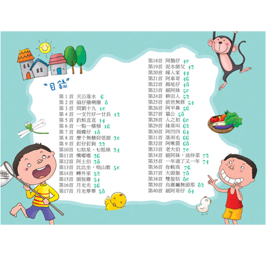 40首趣味客家歌謠,陪孩子體驗客家文化之美。 每首好聽的歌謠都能使孩子體會風土民情。 配合歌詞意境的精美插圖,讓孩子明白歌謠的含意。 CD為專業的客語發音,讓孩子學會正確的客語發音! 「天公啊,落水喲……」輕鬆有趣的客家歌謠,讓孩子能愉快的學習客語發音。在精美插圖搭配下,孩子能從中體會歌謠的意義,親子一同念唱,體驗客家文化之美。40首客家歌謠以趣味詼諧為主,內容隱含了客家傳統文化的意念,培養現代孩子的鄉土情懷,讓孩子自然而然朗朗上口。