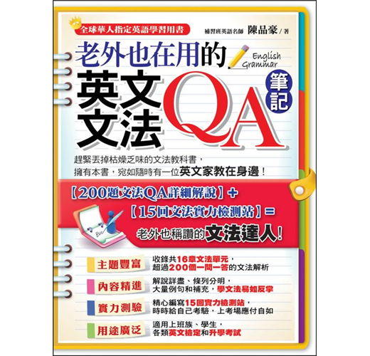 有鑑於此,這本「老外也在用的英文文法QA筆記」就是專門幫助學習者理解正確英文文法所規劃出版。本書首創最活潑的「QA問答學習法」,跳脫傳統文法書僵硬、死板的編寫形式,改以一問一答的方法,替學習者解決對英文文法的所有疑問,就像在網路上的知識交流一般,既簡單又輕鬆,所有的問題均由淺入深,並有詳盡的解說及完整的例句。每個單元最後還會有實力檢測站,讓學習者測驗自己的理解程度,不知不覺文法能力就大幅提升。