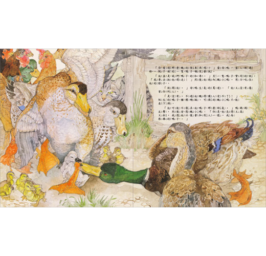 另一個插畫特點是,插畫家運用最近焦的視覺角度,將主角呈現在最近景的位置,用來凸顯故事主角的特性,例如在P13,把母鴨的構圖拉大,不只畫出臉部的表情,更畫出小鴨從蛋殼裡爬出、或是已能穩穩站立的可愛模樣。