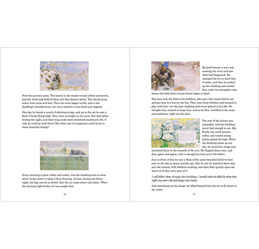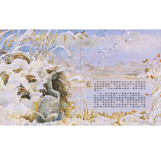 再看P16~17中野鵝群飛的場面,讀者彷彿能聽得到牠們拍打翅膀的吵雜聲呢!P24~25裡出現的醜小鴨,他沾著一身雪花、抬頭看著其他天鵝展翅高飛,那種無耐的眼神和孤獨的身影,表現得真是生動,也讓讀者看了心疼不已!